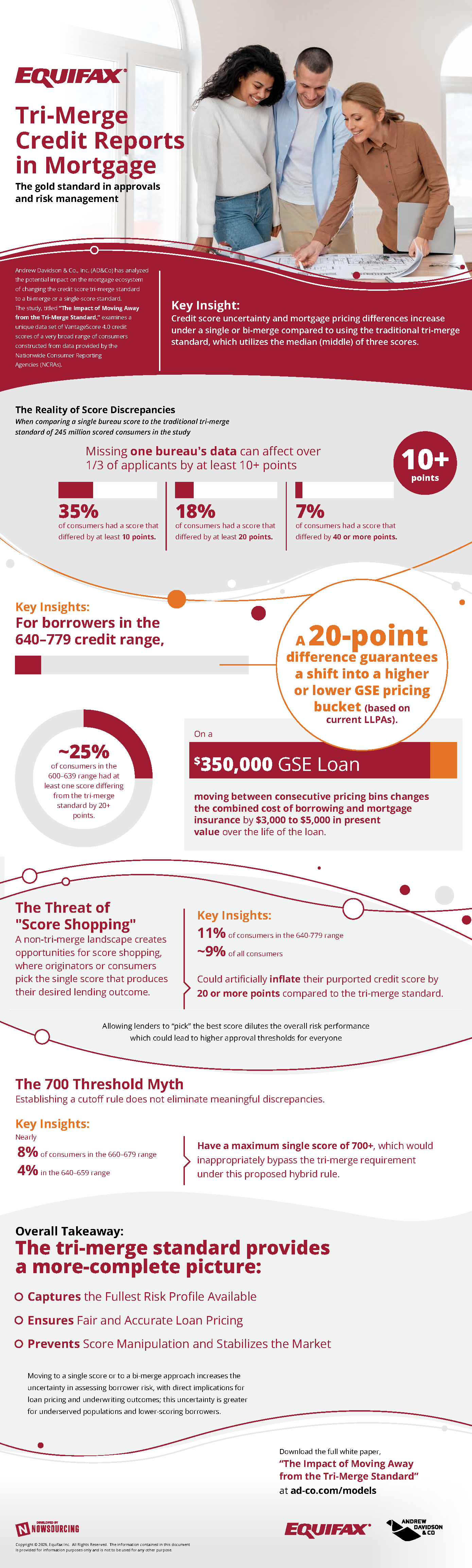 Here is an interesting infographic from the people at the credit bureau called Equifax that provides information from a study by Andrew Davidson and Company where they analysed the potential impact on the mortgage ecosystem of changing the credit score tri-merge standard to a bi-merge or a single score standard. One of the key insights is that credit score uncertainty and mortgage pricing differences increase under a single or bi-merge compared to using the traditional tri-merge standard, which utilises the median (middle) of three sores.