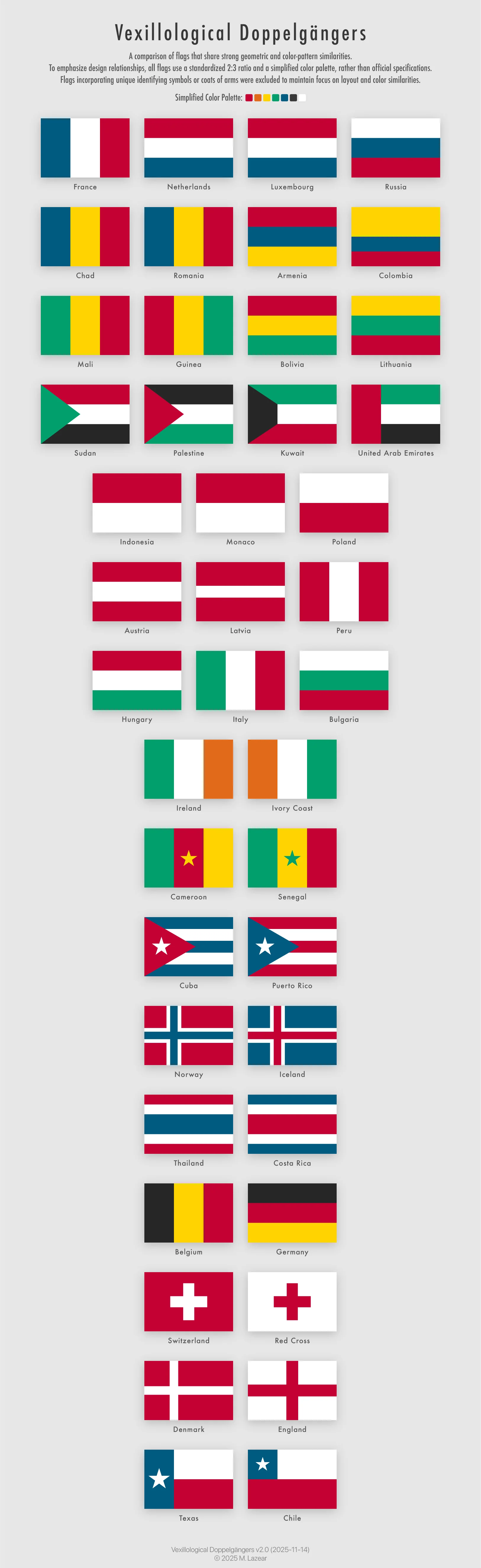 Here is an interesting vexillology infographic designed by M. Lazear that shows vexillological doppelgangers – Flags from around the world with similar geometric and colour patterns. Take a look at this great design to learn about flags that are similar to the flag of France, flags that are similar to the flag of Chad, flags that are similar to the flag of Mali, flags that are similar to the flag of Sudan, flags that are similar to the flag of Indonesia and plenty more.